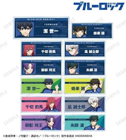 潔 世一、蜂楽 廻、千切 豹馬、凪 誠士郎、御影 玲王、糸師 凛の描き下ろしイラストをアクリルネームプレートに仕上げました。