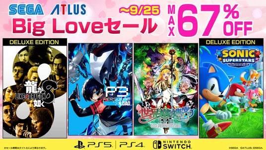 株式会社セガは、PlayStation(TM)Storeおよびニンテンドーeショップにて販売中の一部PlayStation(R)5/PlayStation(R)4/Nintendo Switch(TM)用タイトルを対象とし、期間限定で特別価格にて販売する「セガ Big Loveセール」を開催中です。