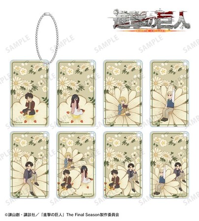 エレン、ミカサ、アルミン、エルヴィン、リヴァイの幼少期のイラストをボタニカルデザインに落とし込んで繊細なタッチで新たに描き起こし、スクエアアクリルキーホルダーに仕上げました。
