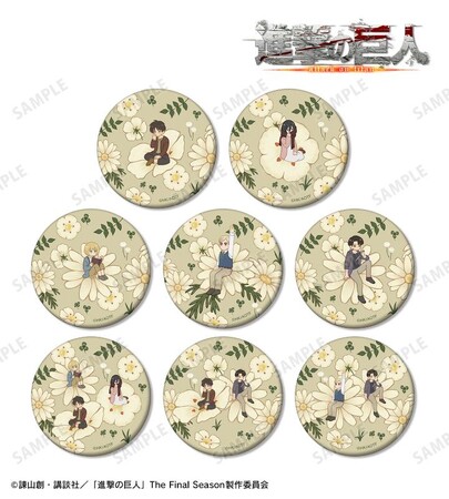 エレン、ミカサ、アルミン、エルヴィン、リヴァイの幼少期のイラストをボタニカルデザインに落とし込んで繊細なタッチで新たに描き起こし、マットな手触りの缶バッジに仕上げました。