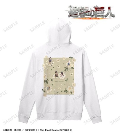 エレン、ミカサ、アルミン、エルヴィン、リヴァイの幼少期のイラストをボタニカルデザインに落とし込んで繊細なタッチで新たに描き起こし、パーカーに仕上げました。