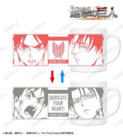 温度に反応する特殊なインクを使用しており、マグカップに温かい飲み物を入れると、エレン、リヴァイの絵柄が変化し、自由の翼のマークが「心臓を捧げよ!」の英訳に変化します。