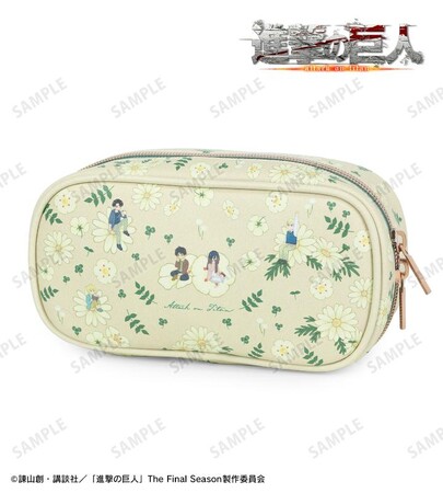 エレン、ミカサ、アルミン、エルヴィン、リヴァイの幼少期のイラストをボタニカルデザインに落とし込んで繊細なタッチで新たに描き起こし、メイクポーチに仕上げました。
