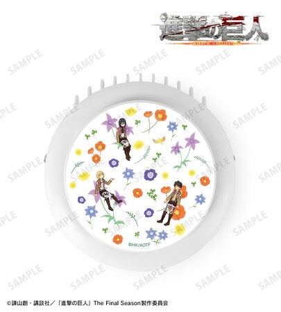 エレン、ミカサ、アルミン、エルヴィン、リヴァイのイラストをボタニカルデザインに落とし込んで繊細なタッチで新たに描き起こし、ハンディファンに仕上げました。