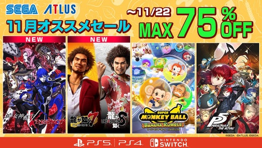 株式会社セガは、PlayStation(TM)Storeおよびニンテンドーeショップにて販売中の一部PlayStation(R)5/PlayStation(R)4/Nintendo Switch(TM)用タイトルを対象とし、期間限定で特別価格にて販売する「11月オススメセール」を開催中です。