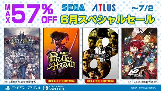 株式会社セガは、PlayStation(TM)Storeおよびニンテンドーeショップにて販売中の一部PlayStation(R)5/PlayStation(R)4/Nintendo Switch(TM)用タイトルを対象とし、期間限定で特別価格にて販売する「セガ 6月スペシャルセール」を開催中です。
