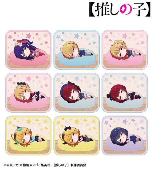 アイ、アクア、ルビー、有馬かな、MEMちょ、黒川あかねがころんと寝ているちびキャラを新たに描き起こし、アクリルカードに仕上げました。