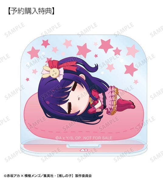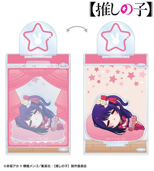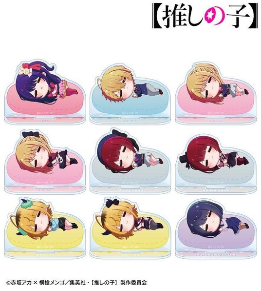 アイ、アクア、ルビー、有馬かな、MEMちょ、黒川あかねがころんと寝ているちびキャラを新たに描き起こし、アクリルスタンドに仕上げました。