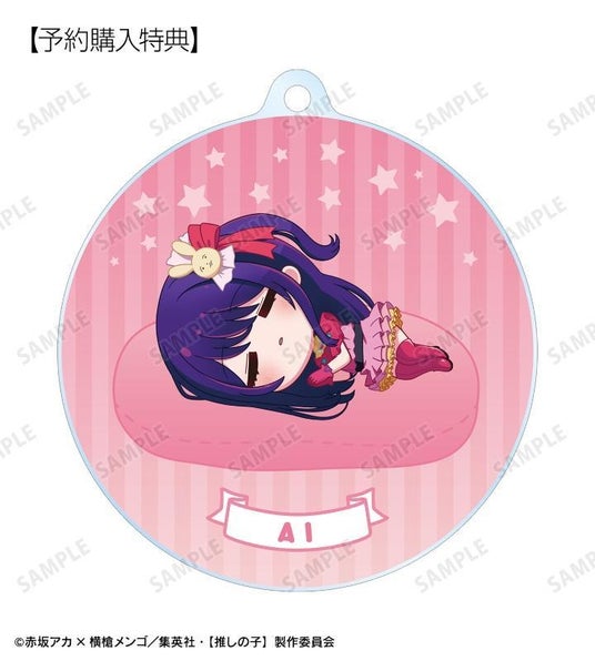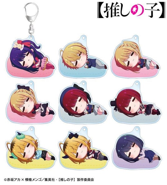 アイ、アクア、ルビー、有馬かな、MEMちょ、黒川あかねがころんと寝ているちびキャラを新たに描き起こし、アクリルキーホルダーに仕上げました。