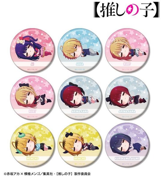 アイ、アクア、ルビー、有馬かな、MEMちょ、黒川あかねがころんと寝ているちびキャラを新たに描き起こし、缶バッジに仕上げました。