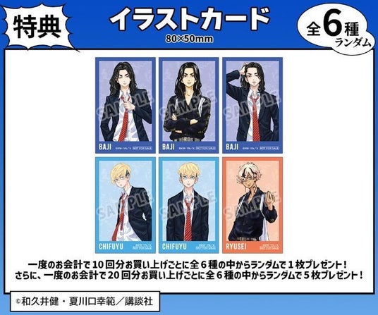 一度のお会計で10回分ご購入ごとに特典イラストカード(全6種)の中からランダムで1枚、20回分ご購入ごとにランダムで5枚プレゼント!