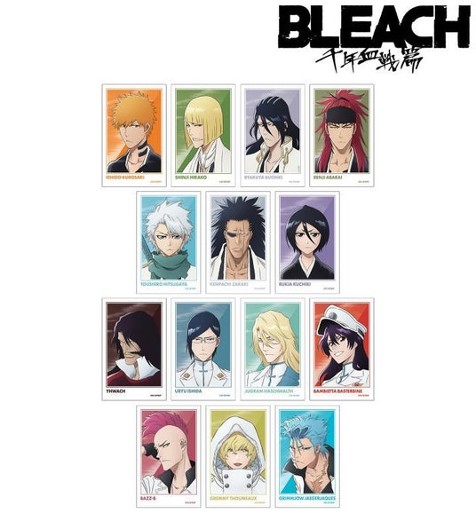 黒崎一護、平子真子、朽木白哉、阿散井恋次、日番谷冬獅郎、更木剣八、朽木ルキア、ユーハバッハ、石田雨竜、ユーグラム・ハッシュヴァルト、バンビエッタ・バスターバイン、バズビー、グレミィ・トゥミュー、グリムジョー・ジャガージャックのイラストをイラストカードに仕上げました。