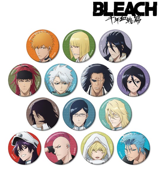 黒崎一護、平子真子、朽木白哉、阿散井恋次、日番谷冬獅郎、更木剣八、朽木ルキア、ユーハバッハ、石田雨竜、ユーグラム・ハッシュヴァルト、バンビエッタ・バスターバイン、バズビー、グレミィ・トゥミュー、グリムジョー・ジャガージャックのイラストをグリッター加工を施した缶バッジに仕上げました。