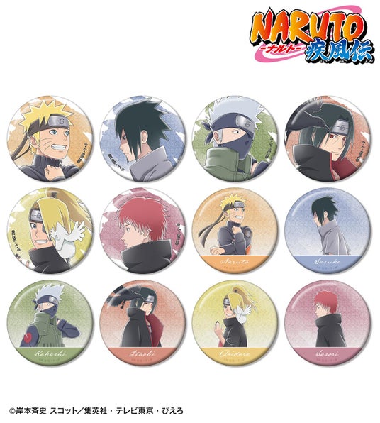 うずまきナルト、うちはサスケ、はたけカカシ、うちはイタチ、デイダラ、サソリの描き下ろしイラストをグリッター加工を施した缶バッジに仕上げました。