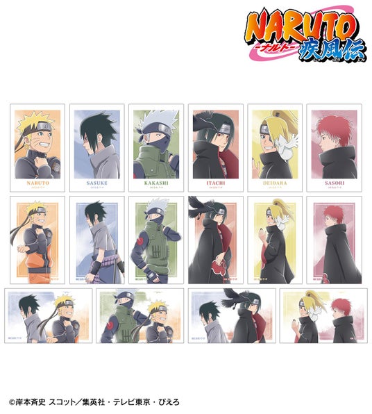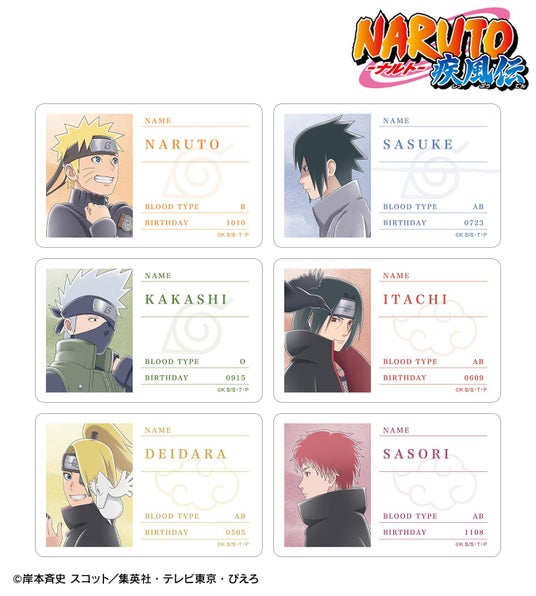うずまきナルト、うちはサスケ、はたけカカシ、うちはイタチ、デイダラ、サソリの描き下ろしイラスト、キャラクターの情報をプラスチックカードに仕上げました。