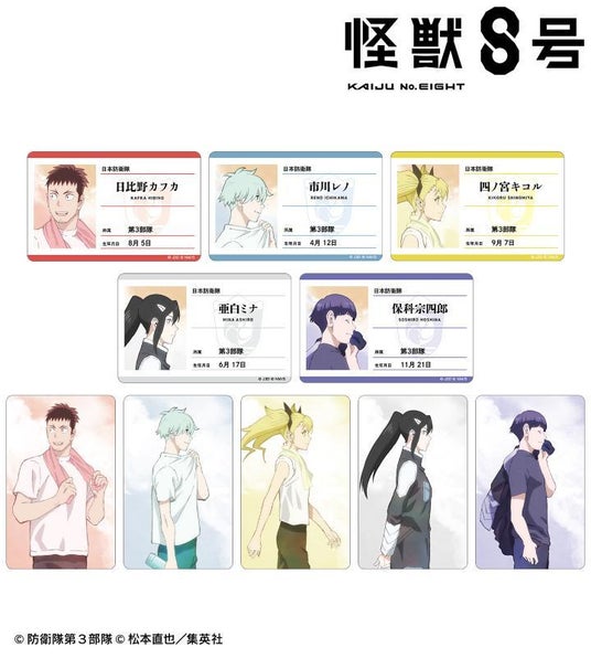 日比野カフカ、市川レノ、四ノ宮キコル、亜白ミナ、保科宗四郎の描き下ろしイラスト、キャラクターの情報をプラスチックカードに仕上げました。