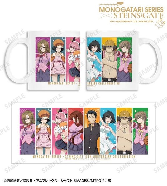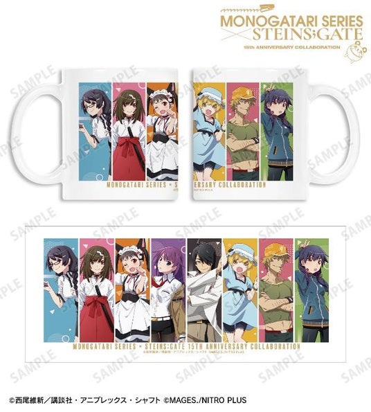 阿良々木暦、戦場ヶ原ひたぎ、忍野忍、八九寺真宵、忍野メメ、千石撫子、神原駿河、羽川翼、岡部倫太郎、牧瀬紅莉栖、椎名まゆり、フェイリス・ニャンニャン、橋田至、漆原るか、阿万音鈴羽、桐生萌郁の描き下ろしコラボイラストをマグカップに仕上げました。