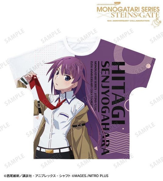 戦場ヶ原ひたぎ、忍野忍、八九寺真宵、千石撫子、神原駿河、羽川翼、牧瀬紅莉栖、椎名まゆり、フェイリス・ニャンニャン、漆原るか、阿万音鈴羽、桐生萌郁の描き下ろしコラボイラスト、キャラクターの名前をメインにフルグラフィックTシャツに仕上げました。