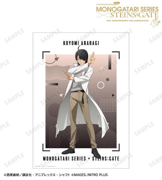 阿良々木暦、戦場ヶ原ひたぎ、忍野忍、八九寺真宵、忍野メメ、千石撫子、神原駿河、羽川翼、岡部倫太郎、牧瀬紅莉栖、椎名まゆり、フェイリス・ニャンニャン、橋田至、漆原るか、阿万音鈴羽、桐生萌郁の描き下ろしコラボイラスト、キャラクターの名前、作品名をA3サイズのマット加工されたポスターに仕上げました。