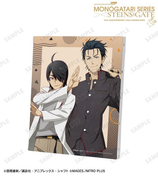 阿良々木暦、戦場ヶ原ひたぎ、忍野忍、八九寺真宵、忍野メメ、千石撫子、神原駿河、羽川翼、岡部倫太郎、牧瀬紅莉栖、椎名まゆり、フェイリス・ニャンニャン、橋田至、漆原るか、阿万音鈴羽、桐生萌郁の描き下ろしコラボイラストをキャンバスボードに仕上げました。