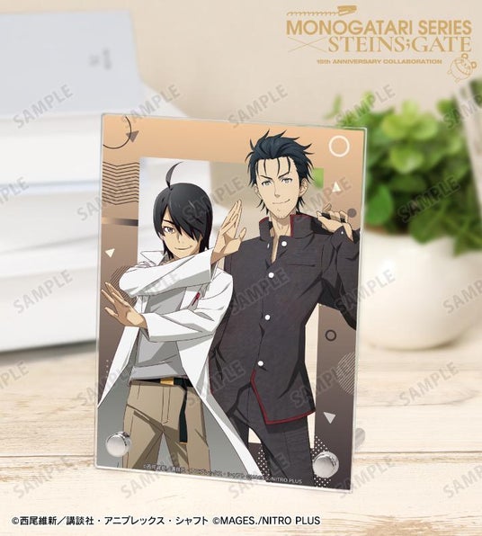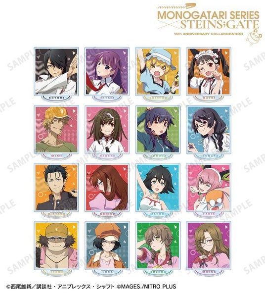 阿良々木暦、戦場ヶ原ひたぎ、忍野忍、八九寺真宵、忍野メメ、千石撫子、神原駿河、羽川翼、岡部倫太郎、牧瀬紅莉栖、椎名まゆり、フェイリス・ニャンニャン、橋田至、漆原るか、阿万音鈴羽、桐生萌郁の描き下ろしコラボイラストをアクリルスタンドに仕上げました。