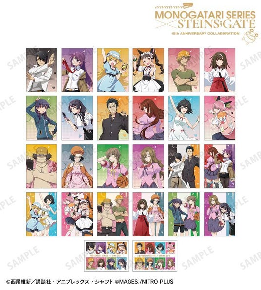 阿良々木暦、戦場ヶ原ひたぎ、忍野忍、八九寺真宵、忍野メメ、千石撫子、神原駿河、羽川翼、岡部倫太郎、牧瀬紅莉栖、椎名まゆり、フェイリス・ニャンニャン、橋田至、漆原るか、阿万音鈴羽、桐生萌郁の描き下ろしコラボイラストをブロマイドに仕上げました。