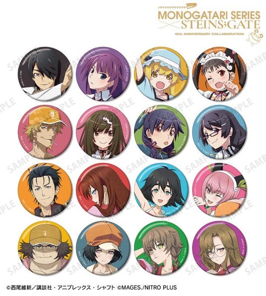 阿良々木暦、戦場ヶ原ひたぎ、忍野忍、八九寺真宵、忍野メメ、千石撫子、神原駿河、羽川翼、岡部倫太郎、牧瀬紅莉栖、椎名まゆり、フェイリス・ニャンニャン、橋田至、漆原るか、阿万音鈴羽、桐生萌郁の描き下ろしコラボイラストを缶バッジに仕上げました。