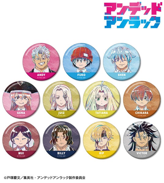 アンディ、出雲風子、シェン、ジーナ、ジュイス、タチアナ、重野力、ムイ、ビリー、リップ、ヴィクトルのイラストを新たなタッチで魅力的に表現し、缶バッジに仕上げました。