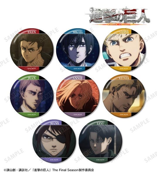 エレン、ミカサ、アルミン、ジャン、アニ、ライナー、ハンジ、リヴァイの印象的なシーン、キャラクターの名前を缶バッジに仕上げました。