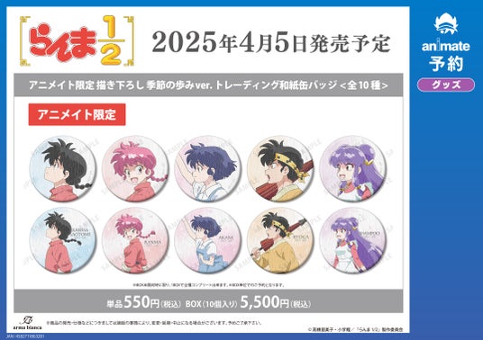2025年4月5日(土)~2025年4月20日(日)のイベント開催期間中、アニメイト対象店舗(通販のぞく)にてTVアニメ「らんま1/2」関連のキャラクターグッズをご購入1,100円(税込)毎に、店舗購入キャンペーン特典「ブロマイド(全6種)」を1枚プレゼント!
