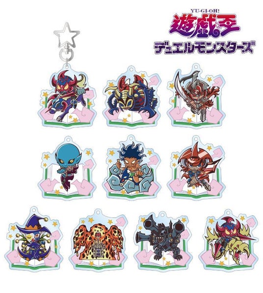 暗黒騎士ガイア、インセクト女王、ギルフォード・ザ・ライトニング、ダーク・ネクロフィア、伝説のフィッシャーマン、炎の剣士、闇・道化師のサギー、溶岩魔神ラヴァ・ゴーレム、リボルバー・ドラゴン、竜騎士ガイアがトゥーンモンスターになったイメージのイラストをアクリルスタンドに仕上げました。