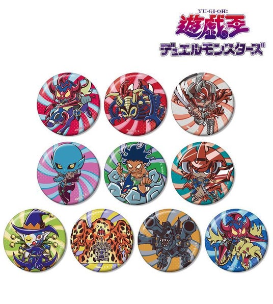 暗黒騎士ガイア、インセクト女王、ギルフォード・ザ・ライトニング、ダーク・ネクロフィア、伝説のフィッシャーマン、炎の剣士、闇・道化師のサギー、溶岩魔神ラヴァ・ゴーレム、リボルバー・ドラゴン、竜騎士ガイアがトゥーンモンスターになったイメージのイラストを缶バッジに仕上げました。