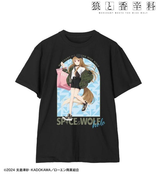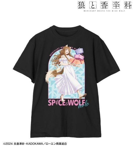 ホロの描き下ろしイラスト、キャラクターの名前、作品名をTシャツに仕上げました。