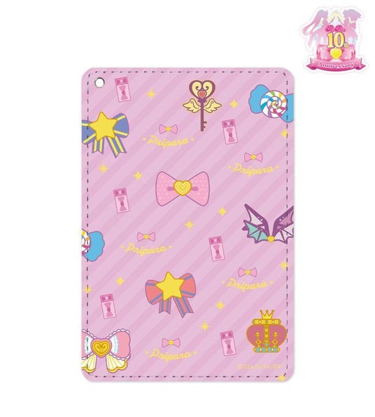 プリパラマイクのリボン、作品ロゴ内のリボン、プリチケをモチーフイラストとして描き起こし、1ポケットパスケースに仕上げました。