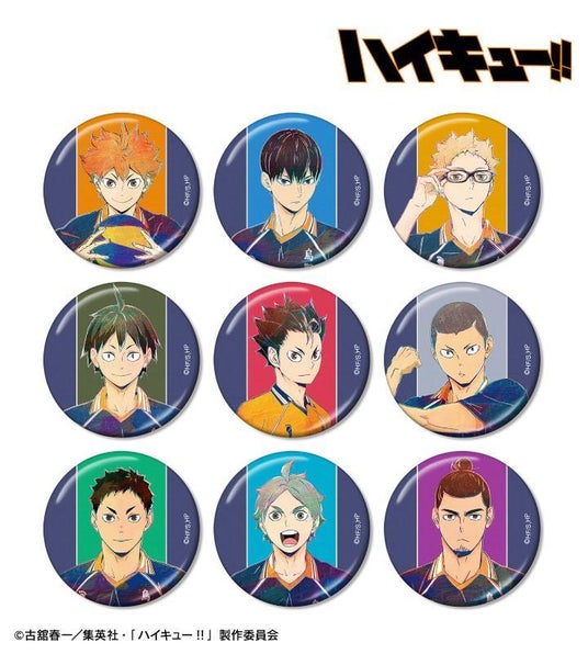 日向翔陽、影山飛雄、月島 蛍、山口 忠、西谷 夕、田中龍之介、澤村大地、菅原孝支、東峰 旭のビジュアルを新たなタッチで魅力的に表現し、メタリック仕様の缶バッジに仕上げました。