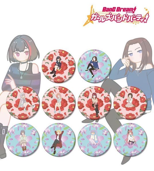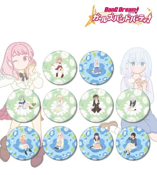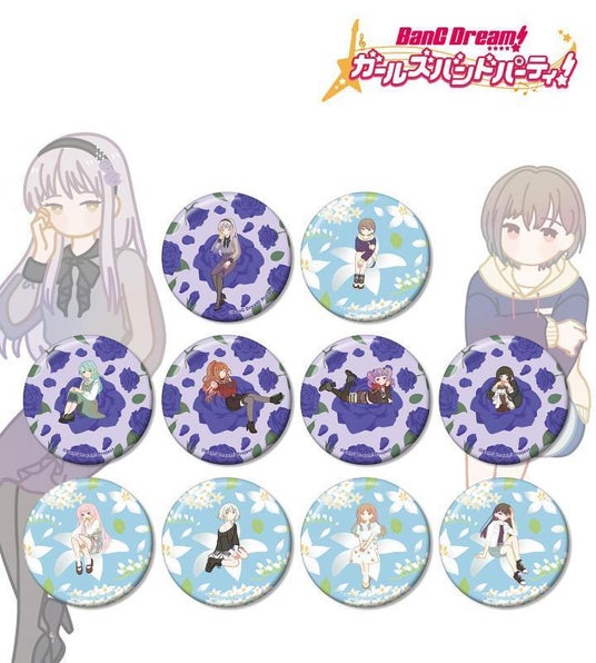 戸山 香澄、花園 たえ、牛込 りみ、山吹 沙綾、市ヶ谷 有咲、弦巻 こころ、瀬田 薫、北沢 はぐみ、松原 花音、奥沢 美咲のイラストをボタニカルデザインに落とし込んで繊細なタッチで新たに描き起こし、缶バッジに仕上げました。