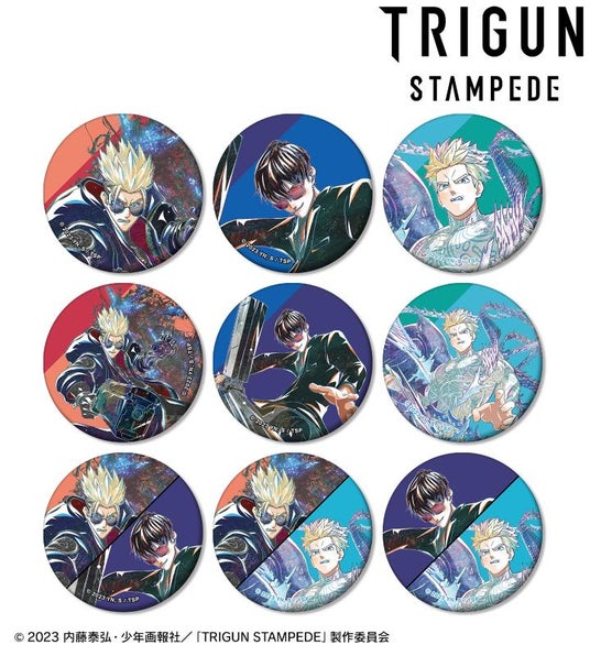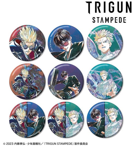 ヴァッシュ・ザ・スタンピード、ニコラス・D・ウルフウッド、ミリオンズ・ナイヴズのビジュアルを新たなタッチで魅力的に表現し、マットな手触りの缶バッジに仕上げました。