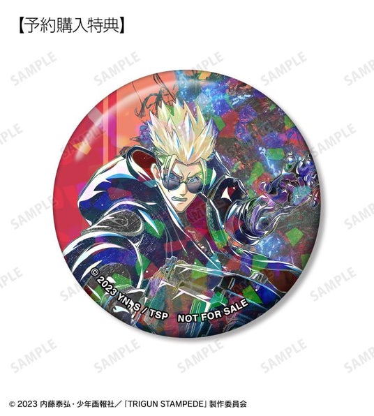 ヴァッシュ・ザ・スタンピード、ニコラス・D・ウルフウッド、ミリオンズ・ナイヴズのビジュアルを新たなタッチで魅力的に表現し、メタリック仕様の缶バッジに仕上げました。