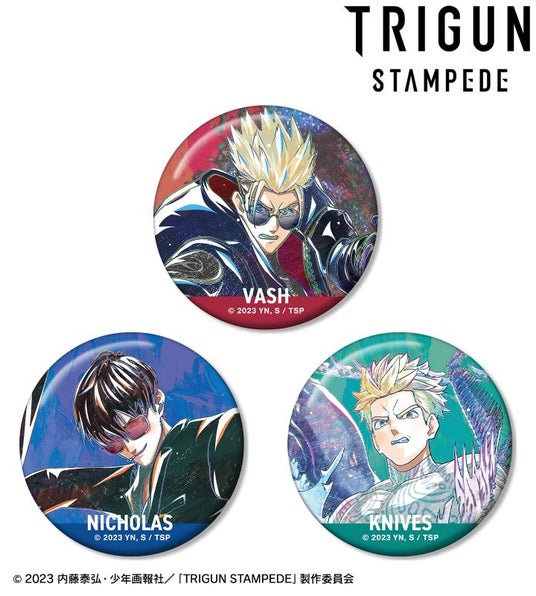 ヴァッシュ・ザ・スタンピード、ニコラス・D・ウルフウッド、ミリオンズ・ナイヴズのビジュアルを新たなタッチで魅力的に表現し、缶バッジ3個セットに仕上げました。