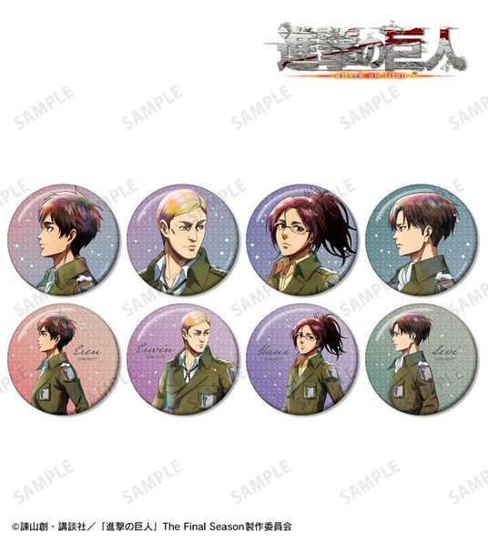 エレン、ミカサ、アルミン、ジャン、エルヴィン、ハンジ、リヴァイのイラストを新たなタッチで魅力的に表現し、BIGな缶バッジに仕上げました。