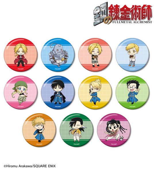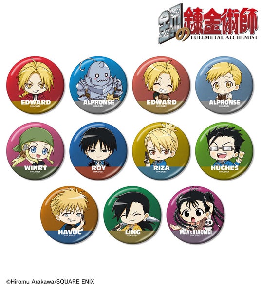 エドワード・エルリック、アルフォンス・エルリック、エドワード・エルリック(幼少期)、アルフォンス・エルリック(幼少期)、ウィンリィ・ロックベル、ロイ・マスタング、リザ・ホークアイ、マース・ヒューズ、ジャン・ハボック、リン・ヤオ、メイ・チャン&シャオメイの描き起こしちびキャライラストをメインにデザインし、缶バッジに仕上げました。