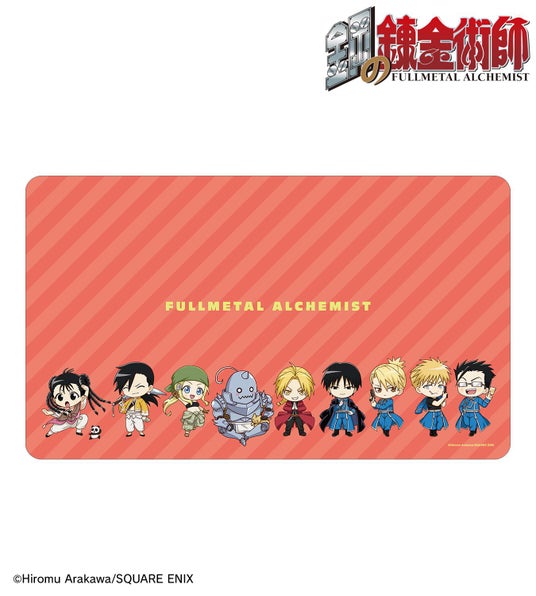 エドワード・エルリック、アルフォンス・エルリック、ウィンリィ・ロックベル、ロイ・マスタング、リザ・ホークアイ、マース・ヒューズ、ジャン・ハボック、リン・ヤオ、メイ・チャン&シャオメイの描き起こしちびキャライラストをメインにデザインし、マルチデスクマットに仕上げました。