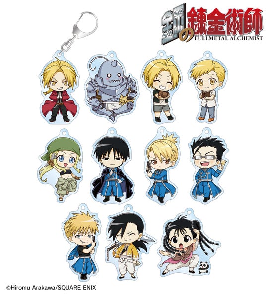 エドワード・エルリック、アルフォンス・エルリック、エドワード・エルリック(幼少期)、アルフォンス・エルリック(幼少期)、ウィンリィ・ロックベル、ロイ・マスタング、リザ・ホークアイ、マース・ヒューズ、ジャン・ハボック、リン・ヤオ、メイ・チャン&シャオメイの描き起こしちびキャライラストをメインにデザインし、アクリルキーホルダーに仕上げました。