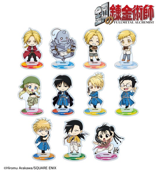 エドワード・エルリック、アルフォンス・エルリック、エドワード・エルリック(幼少期)、アルフォンス・エルリック(幼少期)、ウィンリィ・ロックベル、ロイ・マスタング、リザ・ホークアイ、マース・ヒューズ、ジャン・ハボック、リン・ヤオ、メイ・チャン&シャオメイの描き起こしちびキャライラストをメインにデザインし、アクリルスタンドに仕上げました。