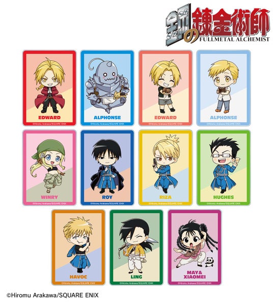 エドワード・エルリック、アルフォンス・エルリック、エドワード・エルリック(幼少期)、アルフォンス・エルリック(幼少期)、ウィンリィ・ロックベル、ロイ・マスタング、リザ・ホークアイ、マース・ヒューズ、ジャン・ハボック、リン・ヤオ、メイ・チャン&シャオメイの描き起こしちびキャライラストをメインにデザインし、アクリルカードに仕上げました。
