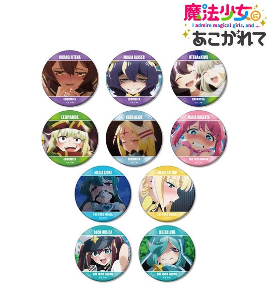 柊 うてな、マジアベーゼ、阿良河 キウィ、レオパルト、ネロアリス、マジアマゼンタ、マジアアズール、マジアサルファ、ロコムジカ、ルベルブルーメの印象的なシーンをマットな手触りの缶バッジに仕上げました。
