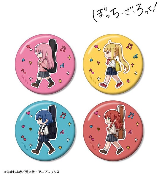 後藤ひとり、伊地知虹夏、山田リョウ、喜多郁代が歩いているちびキャラを新たに描き起こし、缶バッジに仕上げました。