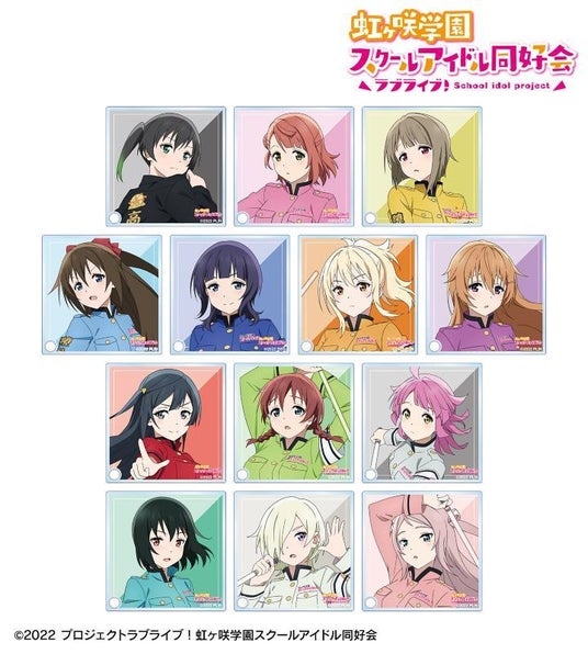 高咲 侑、上原歩夢、中須かすみ、桜坂しずく、朝香果林、宮下 愛、近江彼方、優木せつ菜、エマ・ヴェルデ、天王寺璃奈、三船栞子、ミア・テイラー、鐘 嵐珠の描き下ろしイラストを手のひらサイズのアクリルパネルに仕上げました。