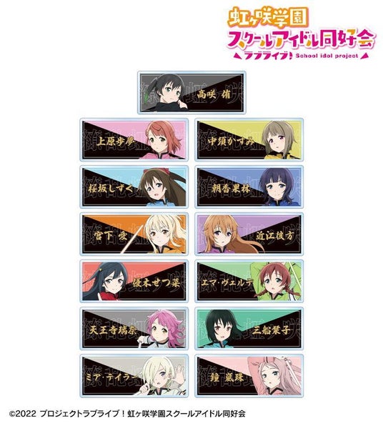 高咲 侑、上原歩夢、中須かすみ、桜坂しずく、朝香果林、宮下 愛、近江彼方、優木せつ菜、エマ・ヴェルデ、天王寺璃奈、三船栞子、ミア・テイラー、鐘 嵐珠の描き下ろしイラスト、メンバーの名前をアクリルネームプレートに仕上げました。