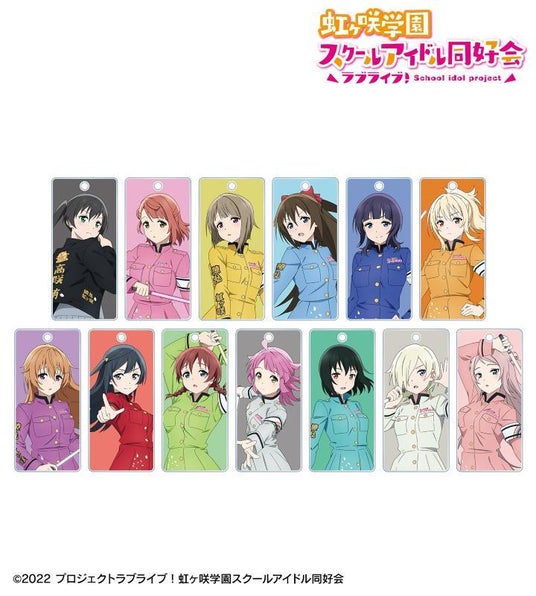高咲 侑、上原歩夢、中須かすみ、桜坂しずく、朝香果林、宮下 愛、近江彼方、優木せつ菜、エマ・ヴェルデ、天王寺璃奈、三船栞子、ミア・テイラー、鐘 嵐珠の描き下ろしイラスト、メンバーの名前をアクリルキータグに仕上げました。